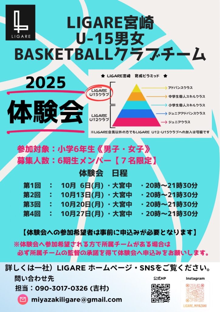 この度、リガーレではU15男女クラブチームの6期生募集開始にあたり体験会を実施します。